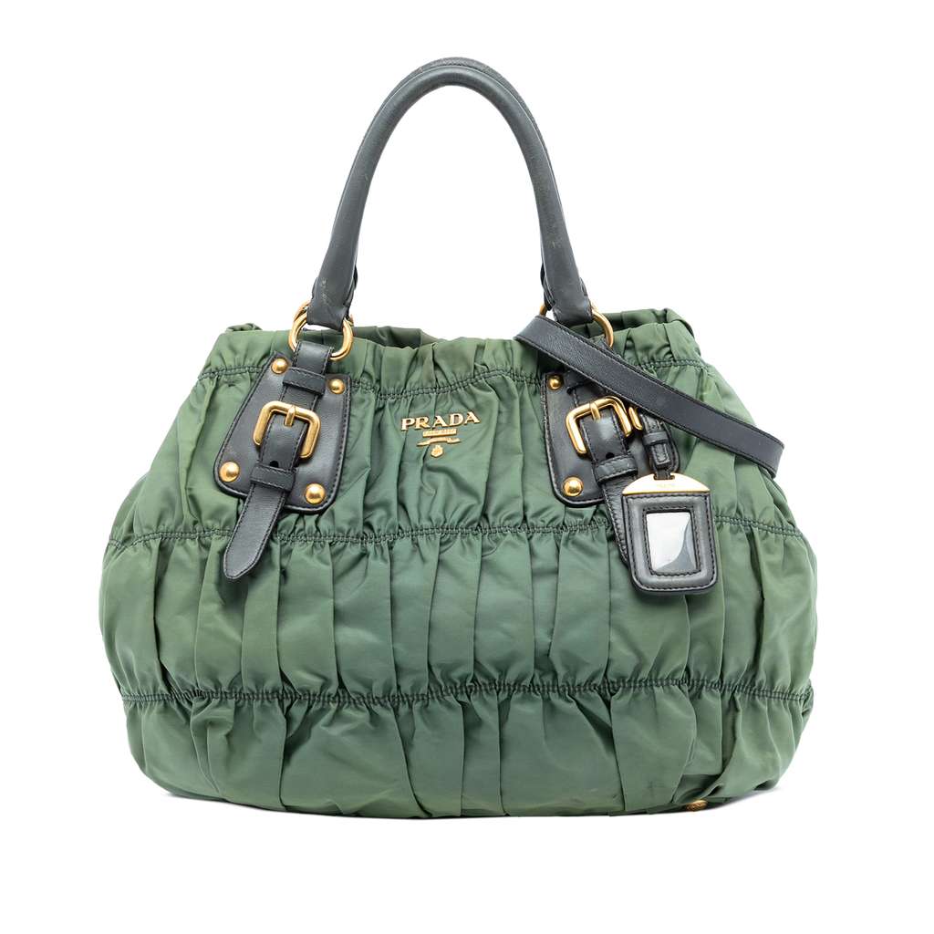 This tote bag features a gathered nylon body with leather trim, rolled leather handles, a top zip closure, and interior zip and slip pockets.