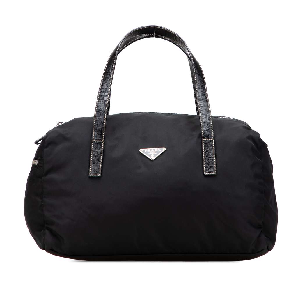 This handbag features a nylon body, flat leather straps, a top zip closure, an exterior side zip pocket, and an interior zip pocket.