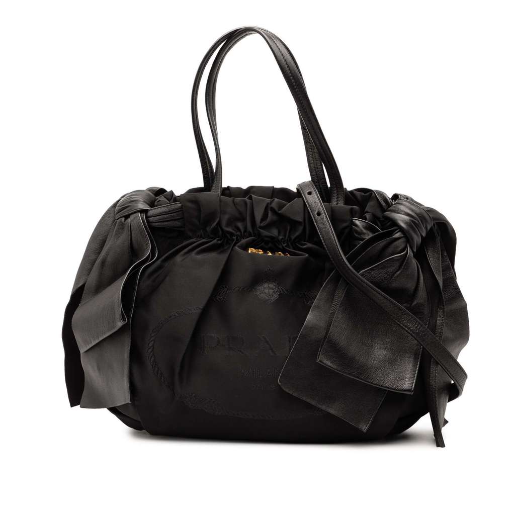 This satchel features a nylon body, flat leather handles, a detachable flat shoulder strap, side bow details, a top magnetic snap button closure, and interior zip and slip pockets.