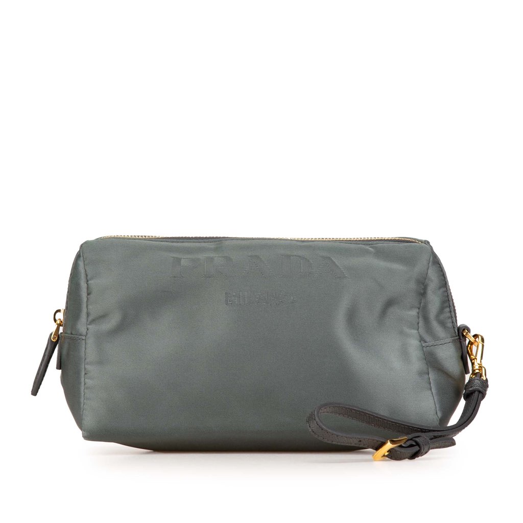 This pouch features a nylon body, a detachable flat leather wrist strap, a top zip closure, and an interior zip pocket.