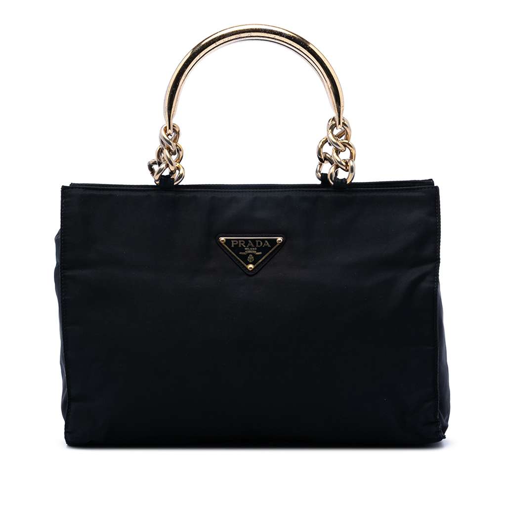 This handbag features a nylon body, gold-tone metal top handles, a top zip closure, and an interior zip pocket.