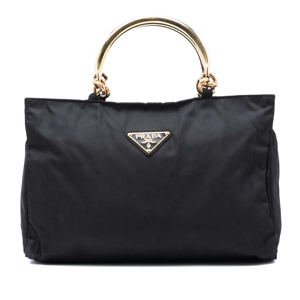 This handbag features a nylon body, gold-tone metal top handles, a top zip closure, and an interior zip pocket.