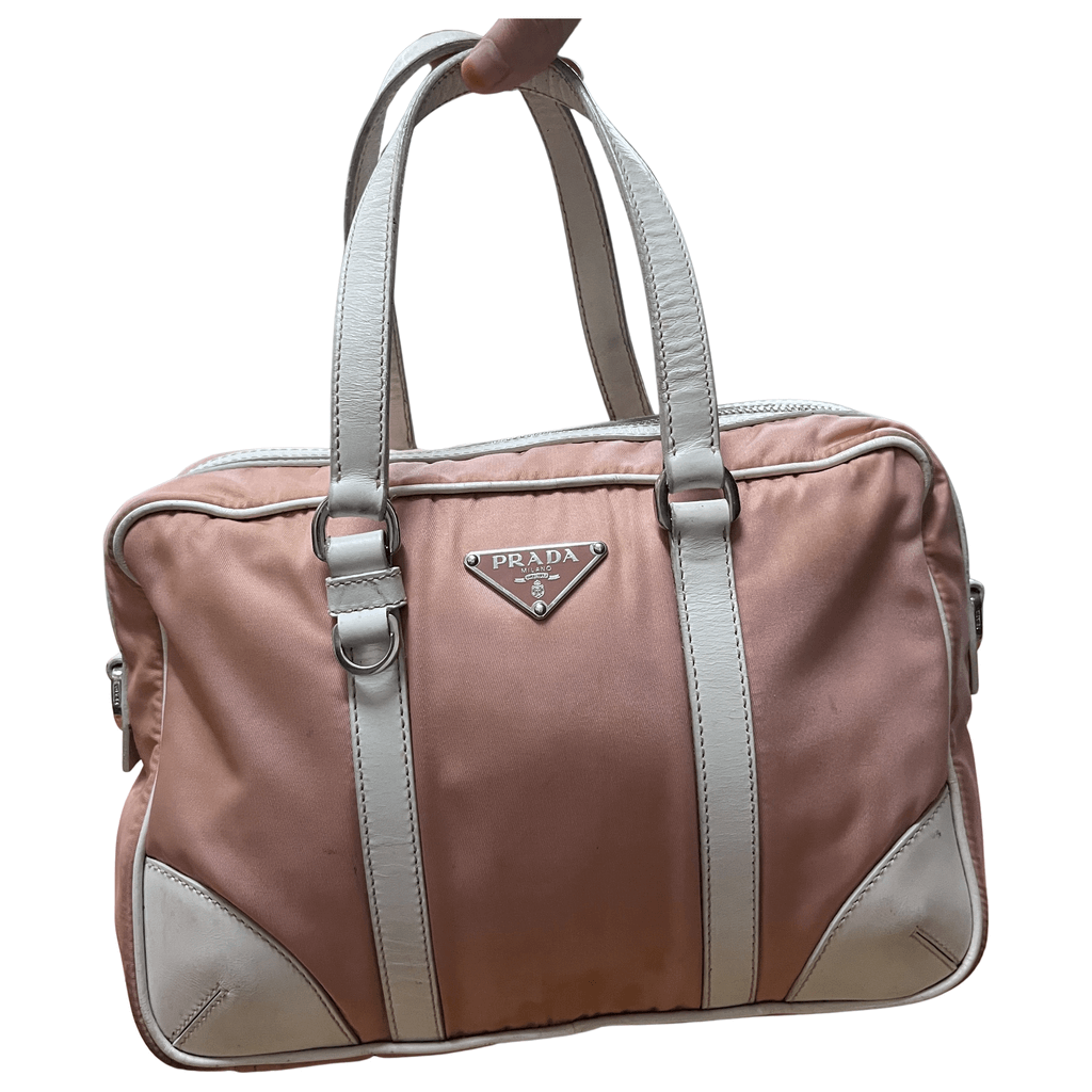 Prada tessuto nylon mini boston bags:Description:A pink nylon (Tessuto) with white leather handles and trim, silver-tone hardware, and a zip-top