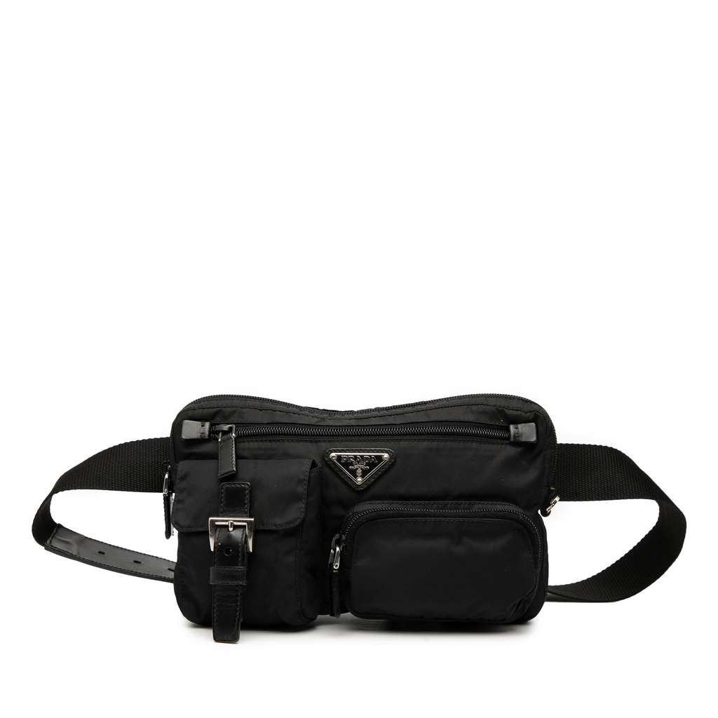 This belt bag features a nylon body, a flat waist strap, a top zip closure, front exterior zip pockets, and a flap pocket with buckle closure.