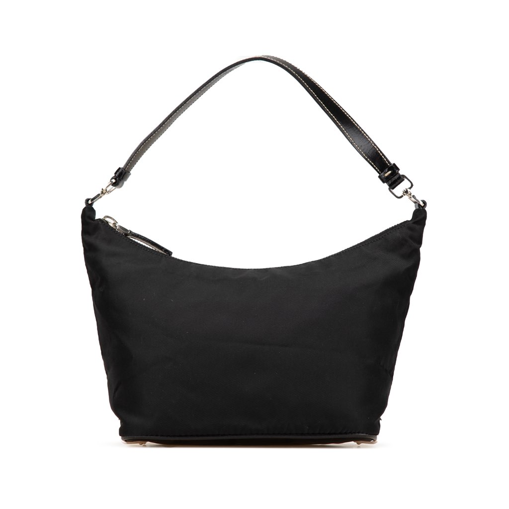 This shoulder bag features a nylon body, a flat leather strap, a top zip closure, and an interior zip pocket.