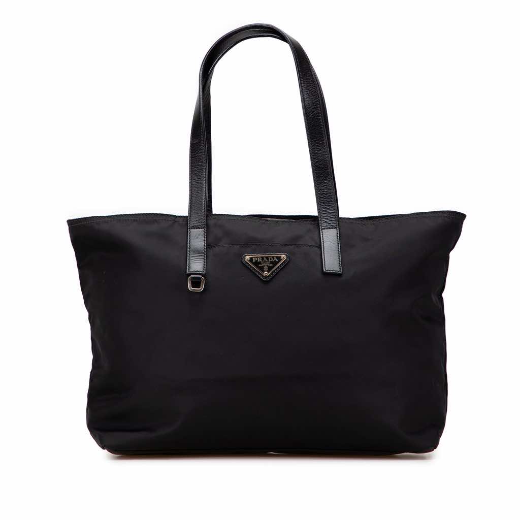 This tote bag features a nylon body, flat leather straps, a top zip closure, an exterior front slip pocket, and an interior zip pocket.