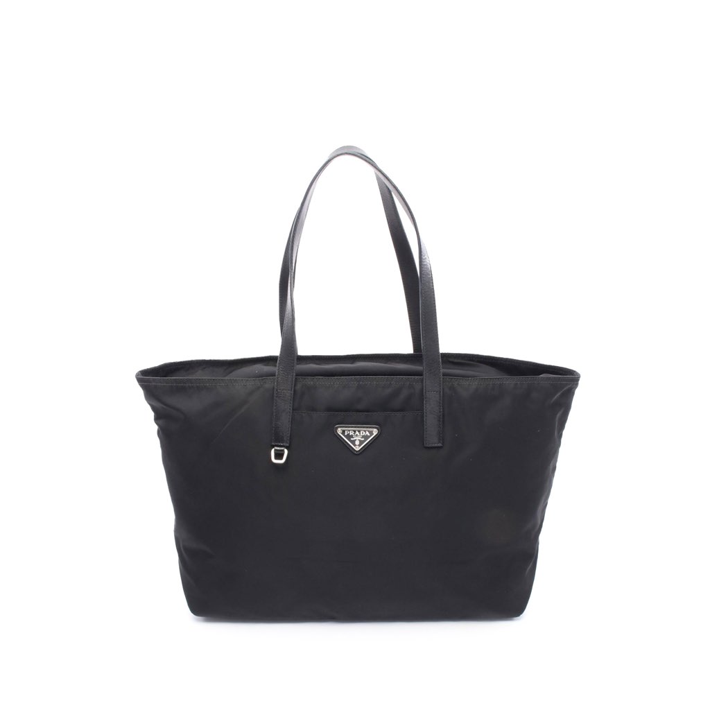 This tote bag features a nylon body, flat leather straps, a top zip closure, an exterior front slip pocket, and an interior zip pocket.
