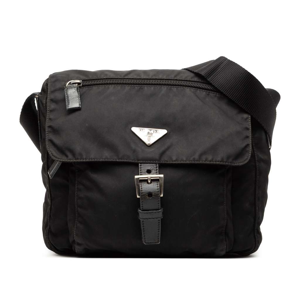 This crossbody features a nylon body, a flat and adjustable shoulder strap, a top flap with buckle closure, and exterior zip pockets.