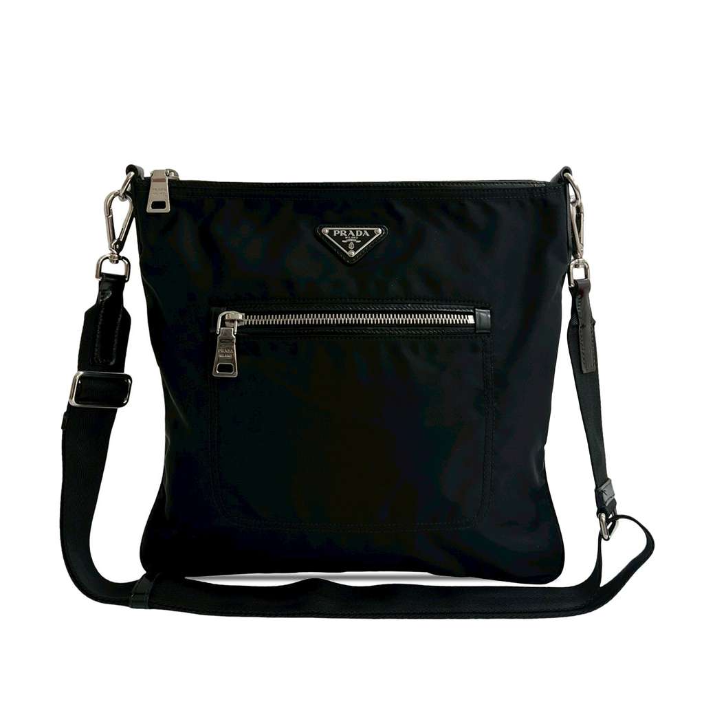 This crossbody bag features a nylon body, an adjustable flat shoulder strap, a top zip closure, an exterior front zip pocket, and an interior zip pocket.