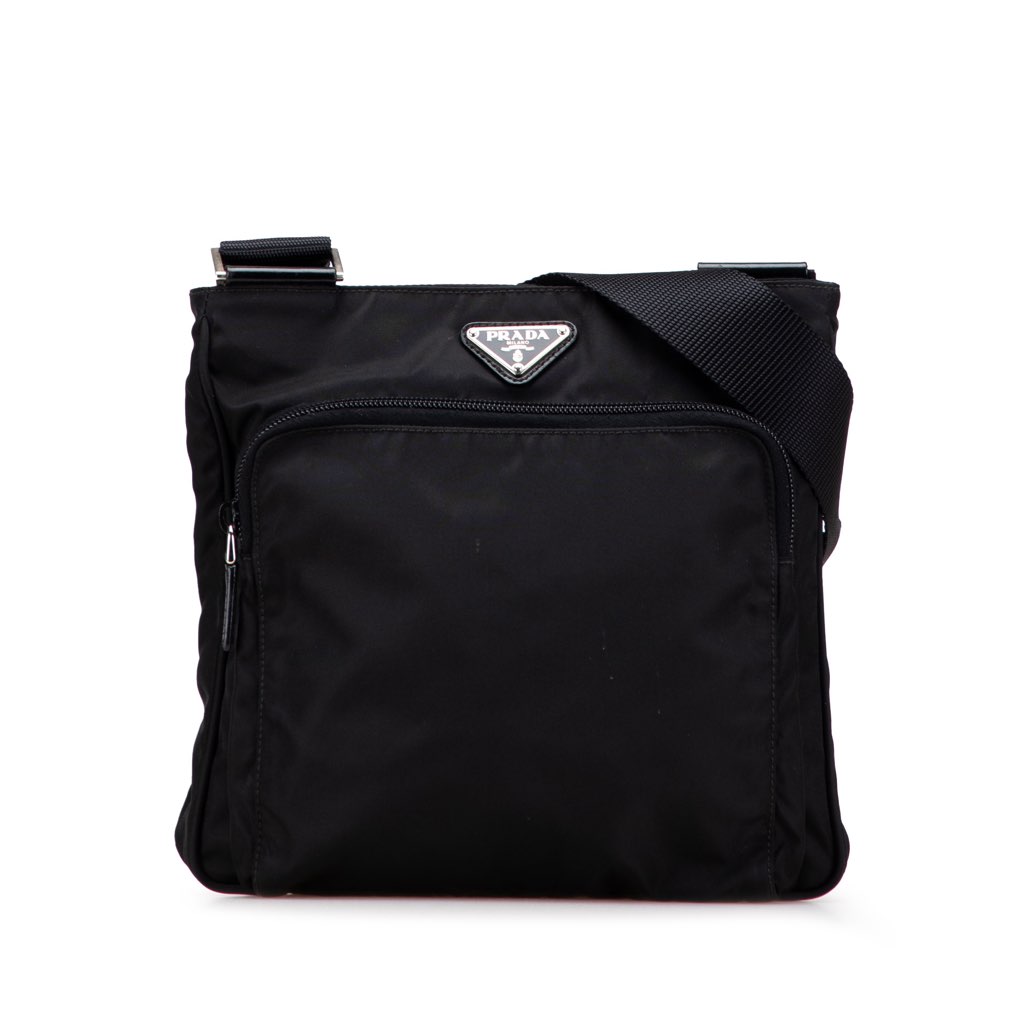 The Tessuto crossbody bag features a nylon body, an adjustable flat strap, a top zip closure, exterior zip pocket, and an interior zip pocket.