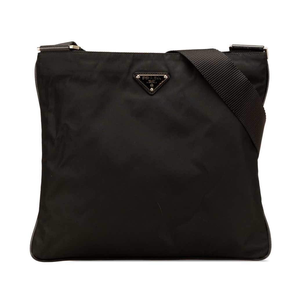 This crossbody bag features a nylon body, an adjustable flat shoulder strap, a top zip closure, and an interior zip pocket.