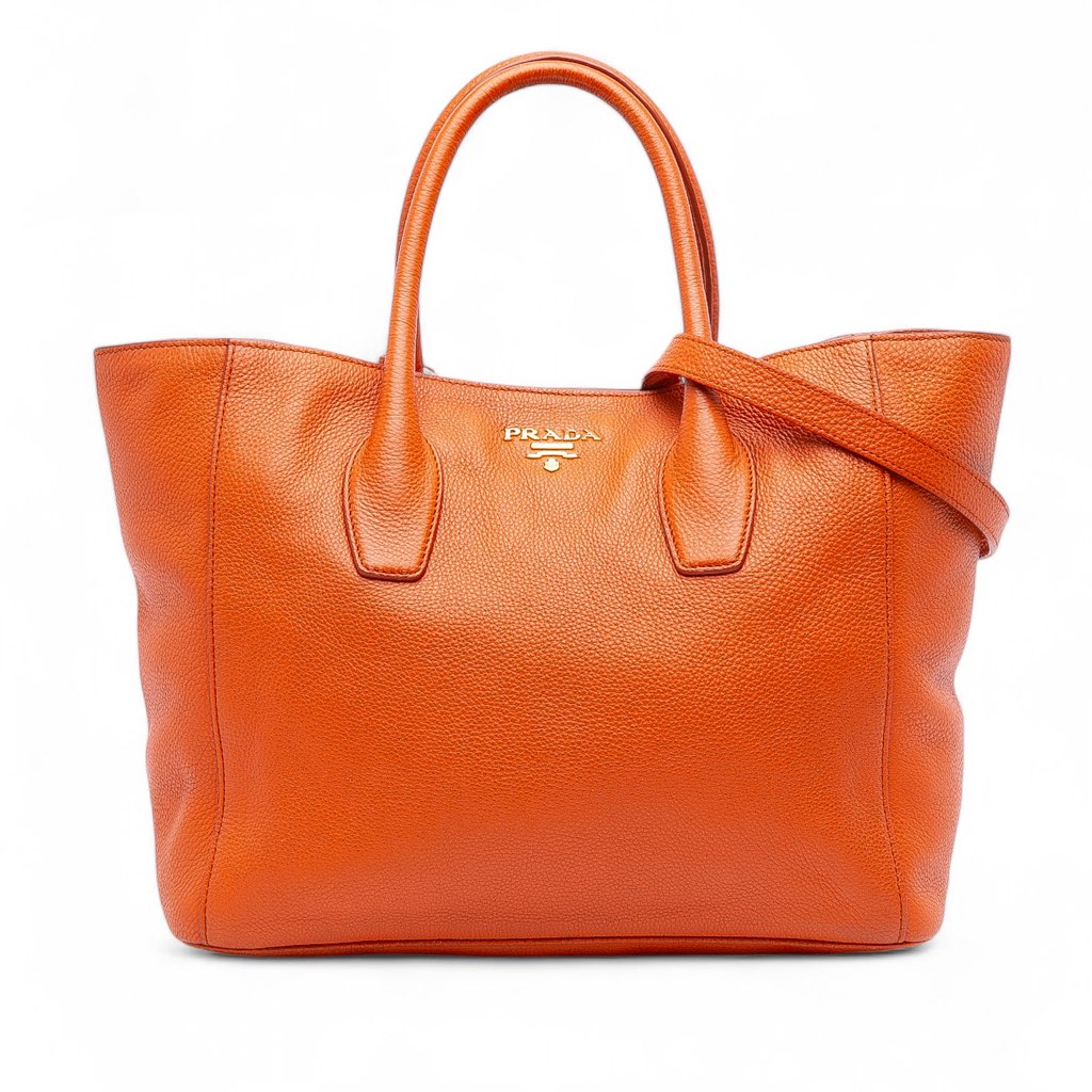 This satchel features a leather body, rolled leather handles, a detachable flat leather shoulder strap, an open top with a snap button closure, and interior zip and slip pockets.