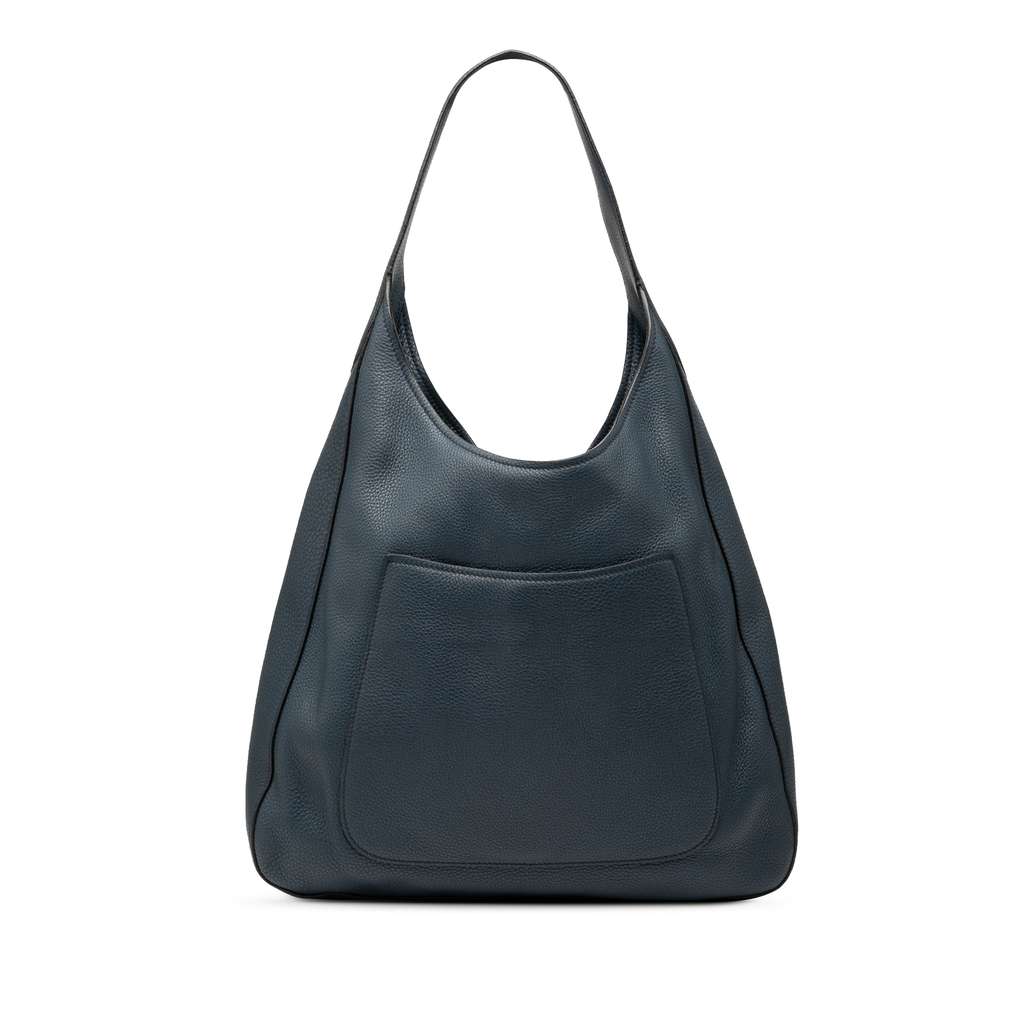 This hobo bag features a leather body, a flat leather shoulder strap, an open top with magnetic closure, an exterior slip pocket, and an interior slip pocket.