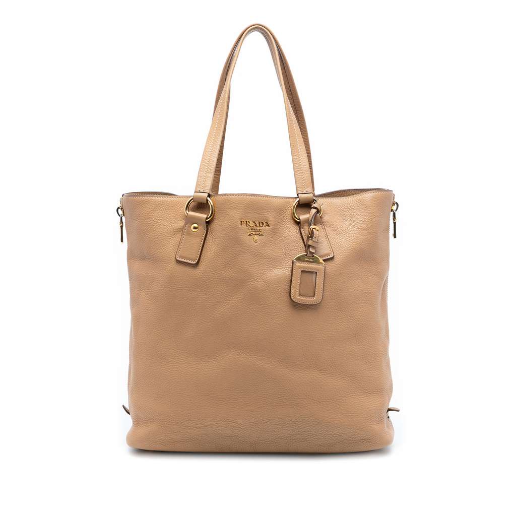 This tote bag features a leather body with size zip expansions, flat leather handles, an open top with snap closure, and interior zip and slip pockets.