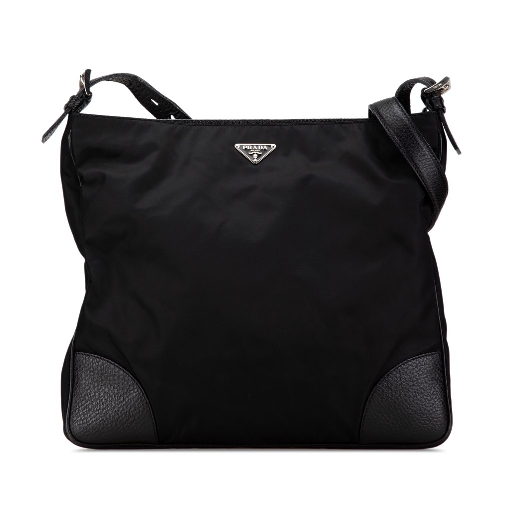 This crossbody bag features a nylon body with leather trim, a flat leather shoulder strap, a top zip closure, and an interior zip pocket.