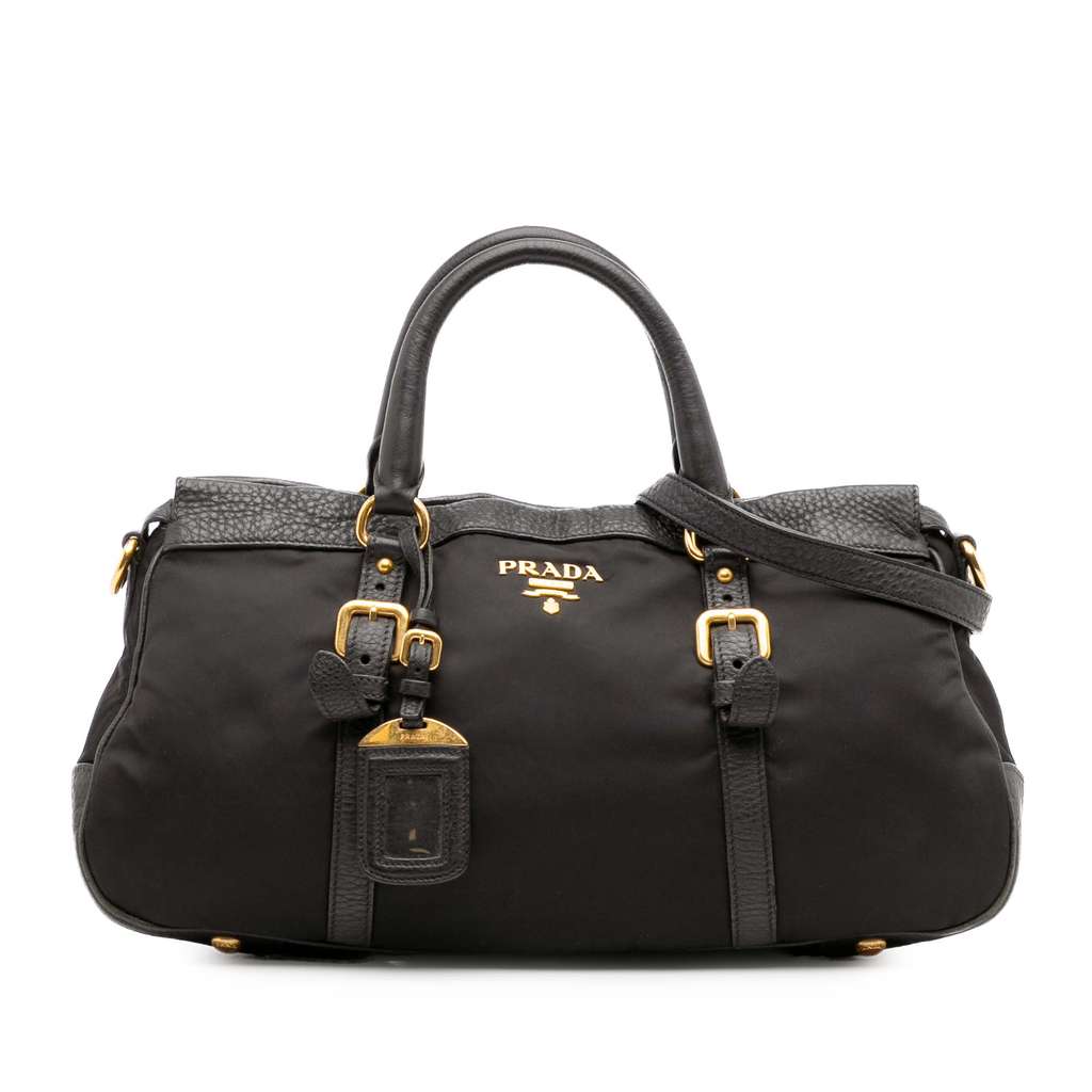 This satchel features a nylon body with leather trim, rolled leather handles, an adjustable flat shoulder strap, a top zip closure, and an interior zip pocket.