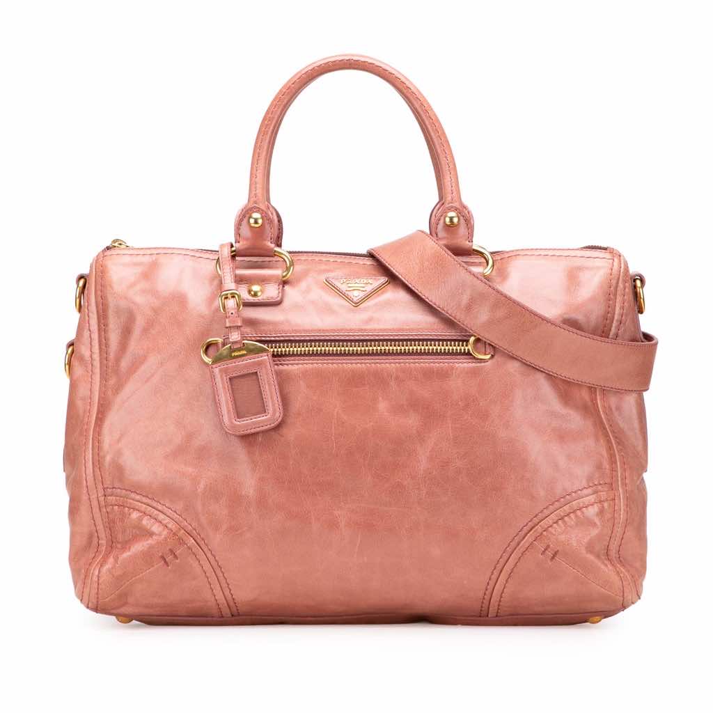 This satchel features a leather body, rolled leather handles, a detachable flat leather strap, a top zip closure, exterior zip pockets, and interior zip and slip pockets.