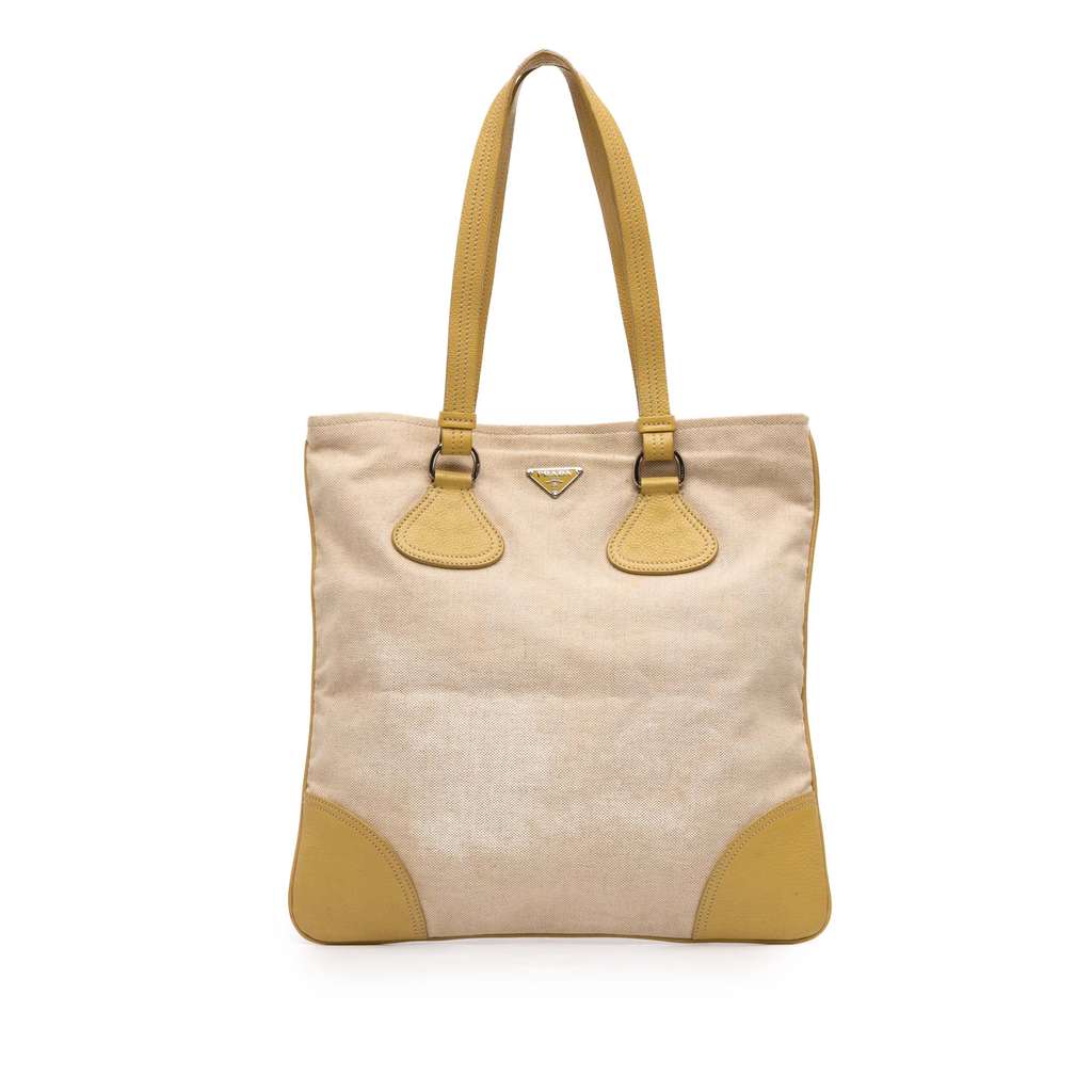 Prada Vitello Trimmed Canvas Canapa Tote Brown X-Large Canva