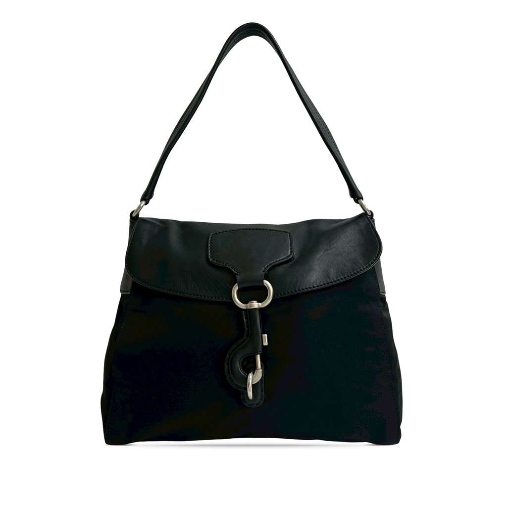 This shoulder bag features a nylon body with leather trim, a flat leather strap, a top flap with a hook closure, and an interior zip pocket.