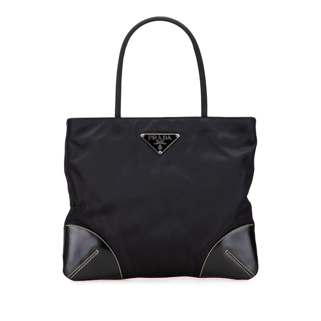 This tote bag features a nylon body with leather trim, rolled nylon handles, a top zip closure, an exterior back zip pocket, and an interior zip pocket.