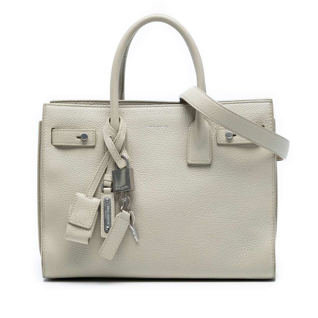 The Baby Sac De Jour satchel features a leather body, rolled leather handles, a detachable flat leather strap, an open top, and an interior zip compartment.