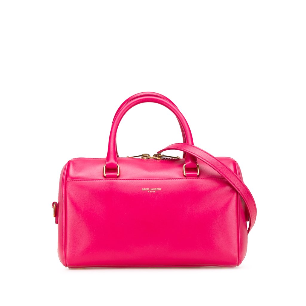 The Classic Baby Duffle features a leather body, rolled leather handles, a detachable flat strap, a top zip closure, and an interior slip pocket.