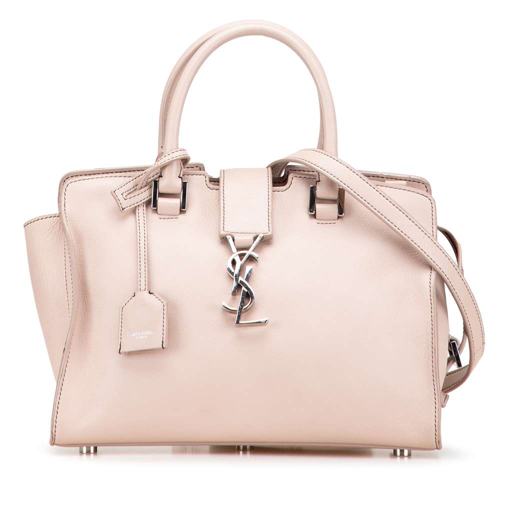 The Downtown Cabas features a leather body, rolled leather handles, a detachable leather strap, a top strap with a magnetic closure, a top zip closure, and an interior slip pocket.