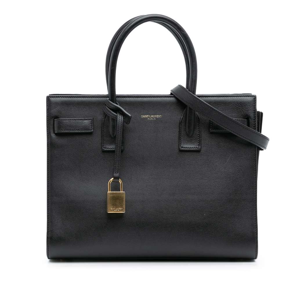 The Baby Sac De Jour satchel features a leather body, rolled leather handles, a detachable flat leather strap, an open top, and interior slip pockets. Exterior back and top has been repainted.
