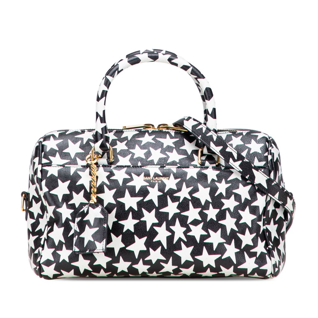 The Classic Baby Duffle features a printed leather body, rolled leather handles, a flat leather strap, a top zip closure, and an interior slip pocket.