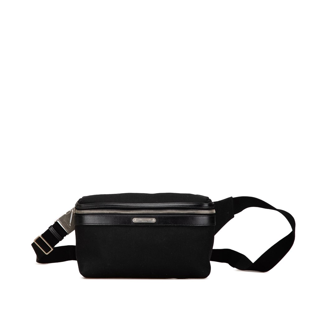 This belt bag features a canvas body with leather trim, an adjustable waist strap with buckle closure, an exterior front zip closure, an exterior back zip pocket, and an interior slip pocket.