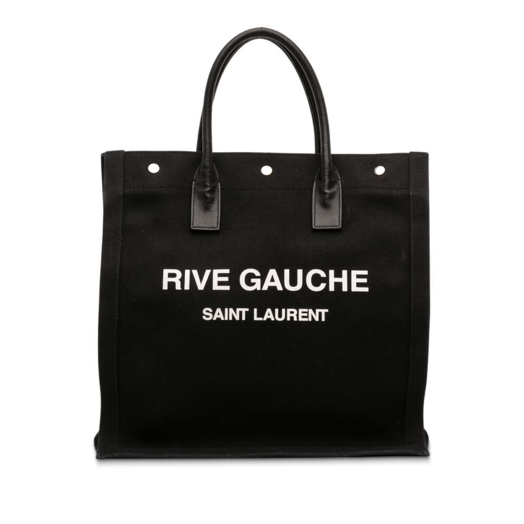 The Rive Gauche tote bag features a canvas body with leather trim, rolled leather handles, an open top with snap button closures, and an interior zip pocket.