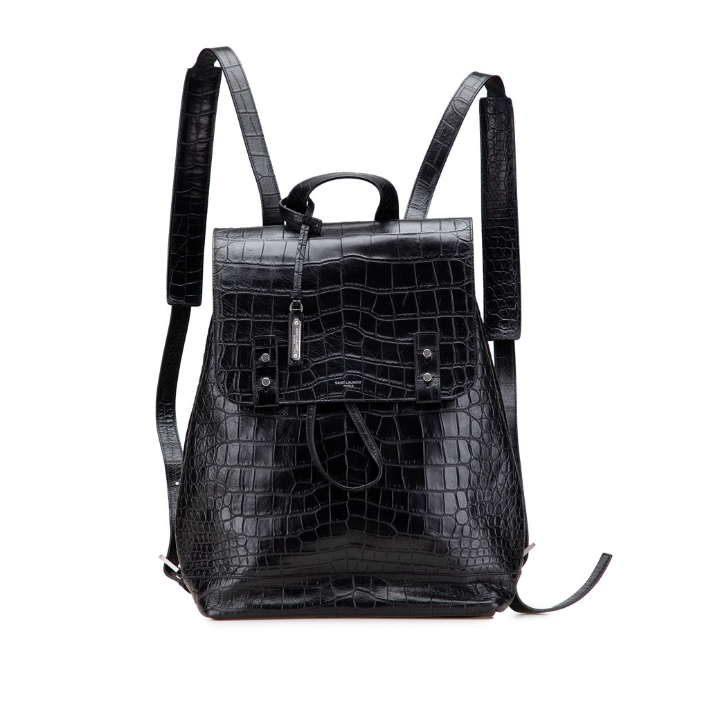 This backpack features an embossed leather body, a flat top handle, adjustable flat back straps, a top flap, an open top with drawstring closure, and an interior zip pocket.