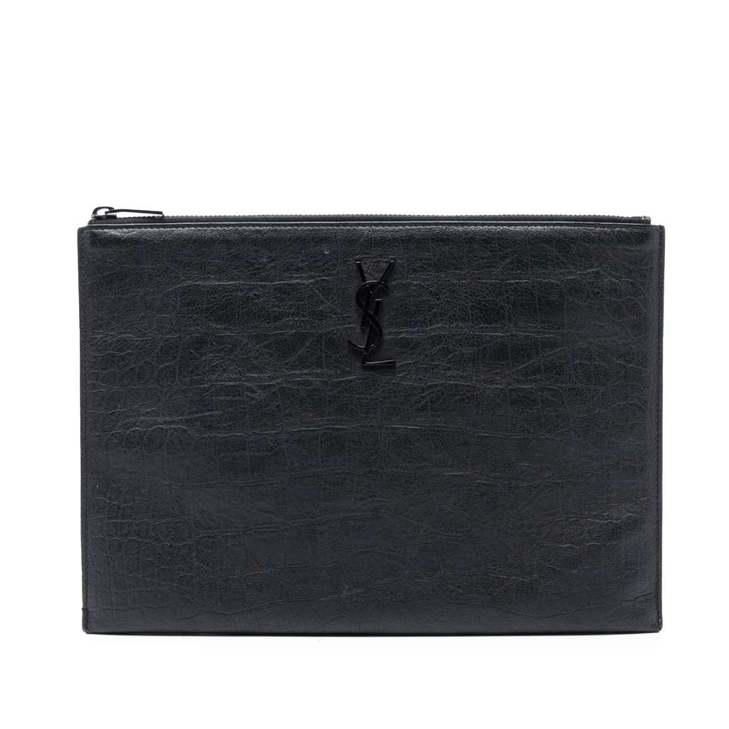 This clutch features an embossed leather body, a top zip closure, and interior slip pockets.