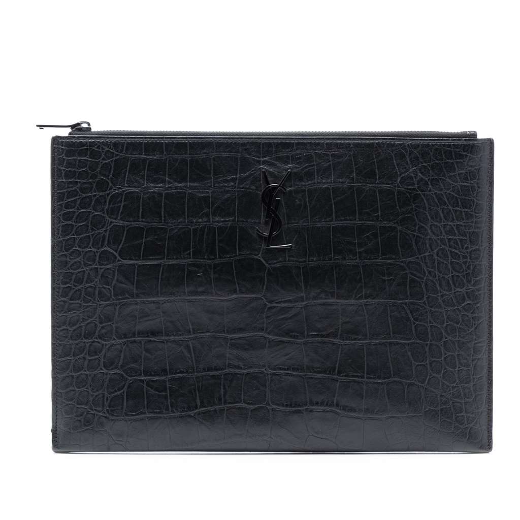 This clutch bag features a croc embossed leather body, top zip closure, and an interior slip pocket.
