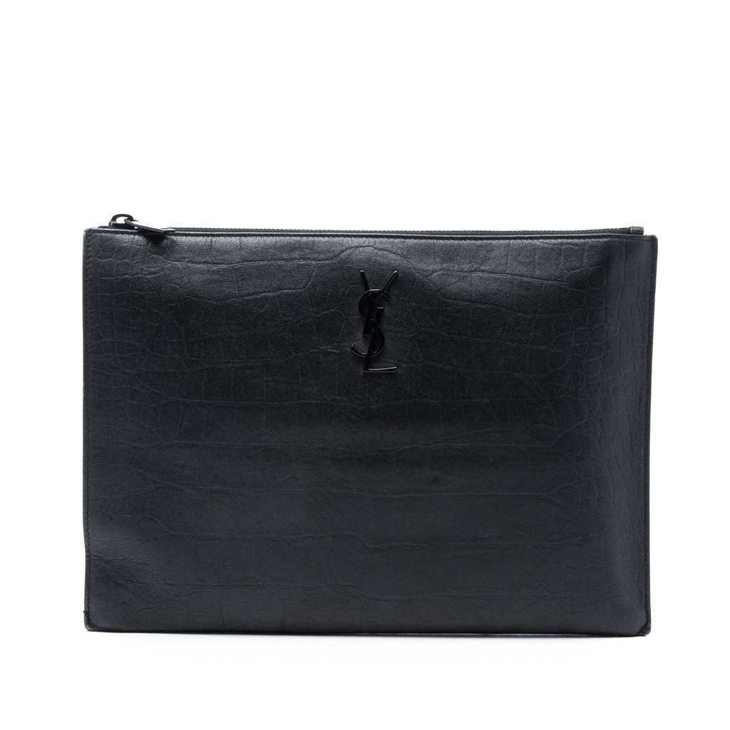 This clutch features an embossed leather body, a top zip closure, and interior slip pockets.