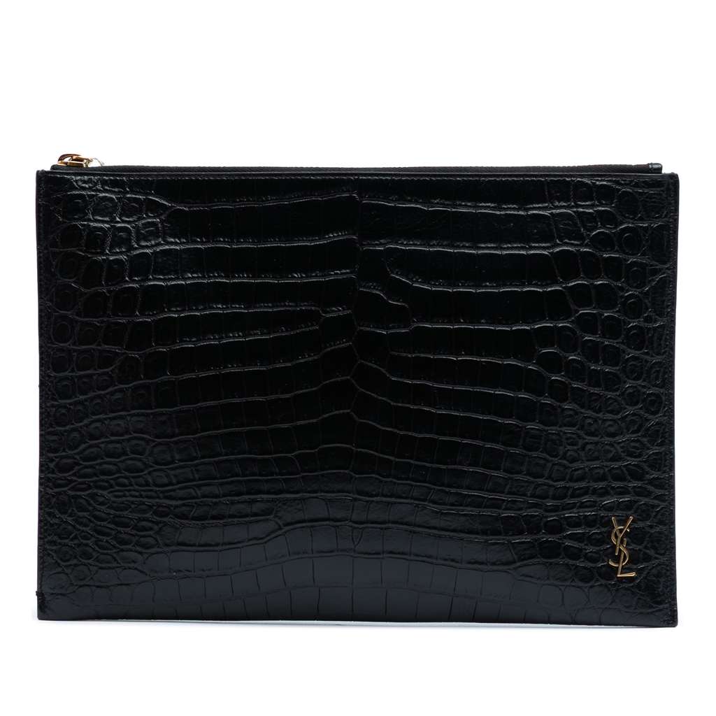 This clutch features an embossed leather body, a top zip closure, and interior slip pockets.