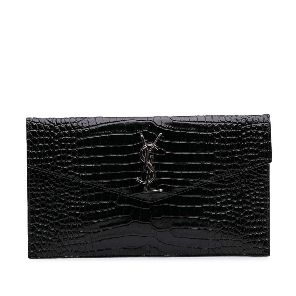 This clutch features an embossed patent leather body and a flap with magnetic snap closure.