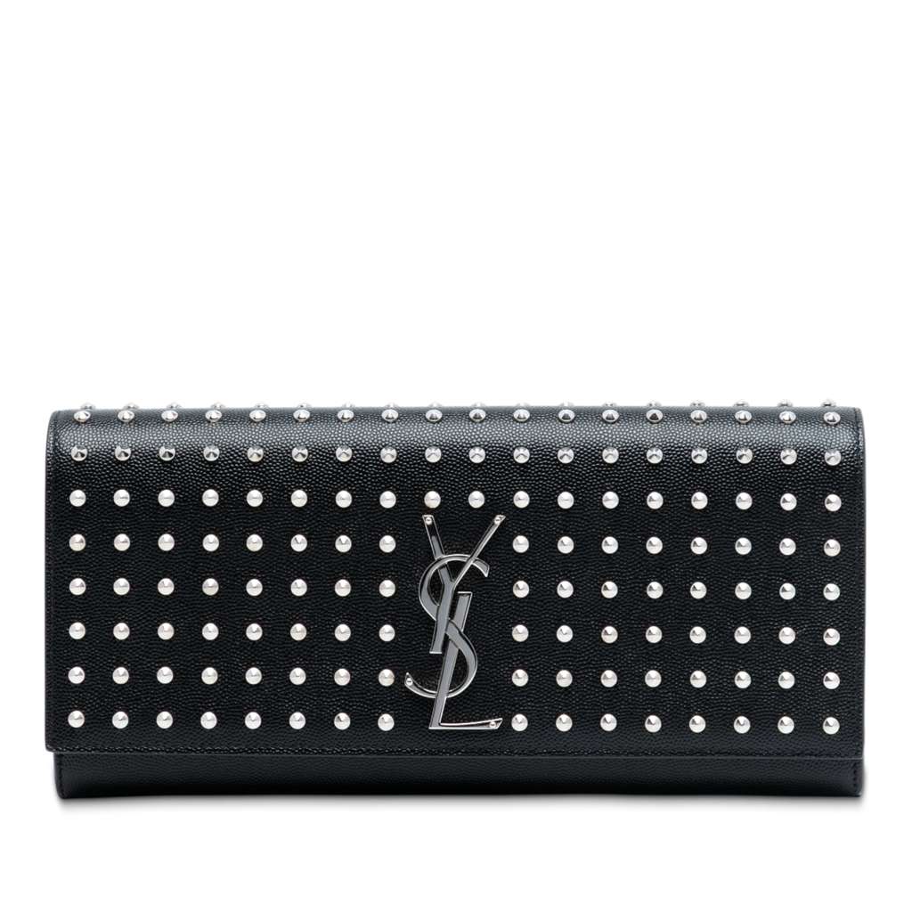 The Monogram Kate clutch bag features a studded leather body, a front flap with magnetic closure, and an interior slip pocket.