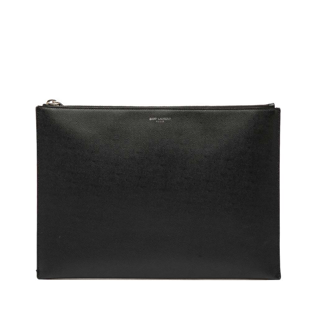 This clutch bag features a leather body, a top zip closure, and interior slip pockets.