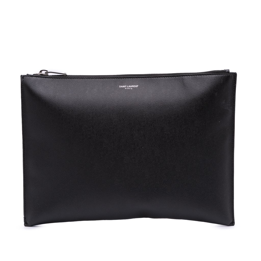 This clutch bag features a leather body, a top zip closure, and interior slip pockets.