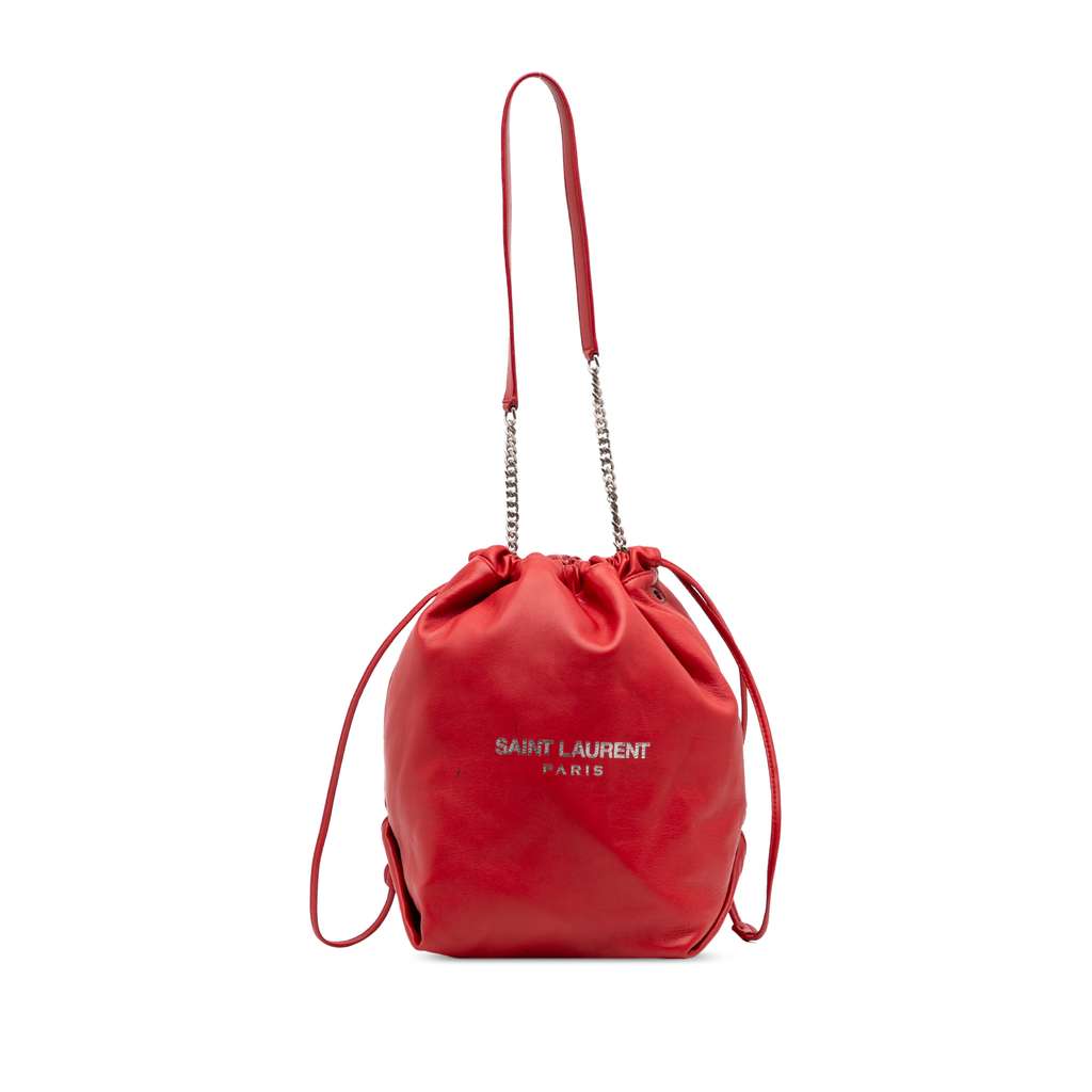 This bucket bag features a leather body, a silver-tone chain strap with leather guard, and an open top with a drawstring closure.