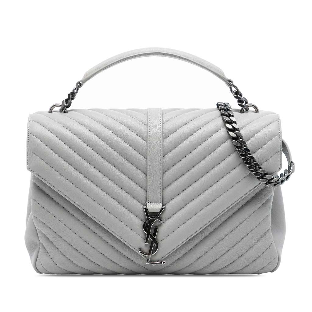 The College satchel features a quilted sheepskin body, a flat leather top handle, a detachable curb chain strap, a front flap with magnetic snap button closure, an exterior slip pocket, and an interior zip compartment.