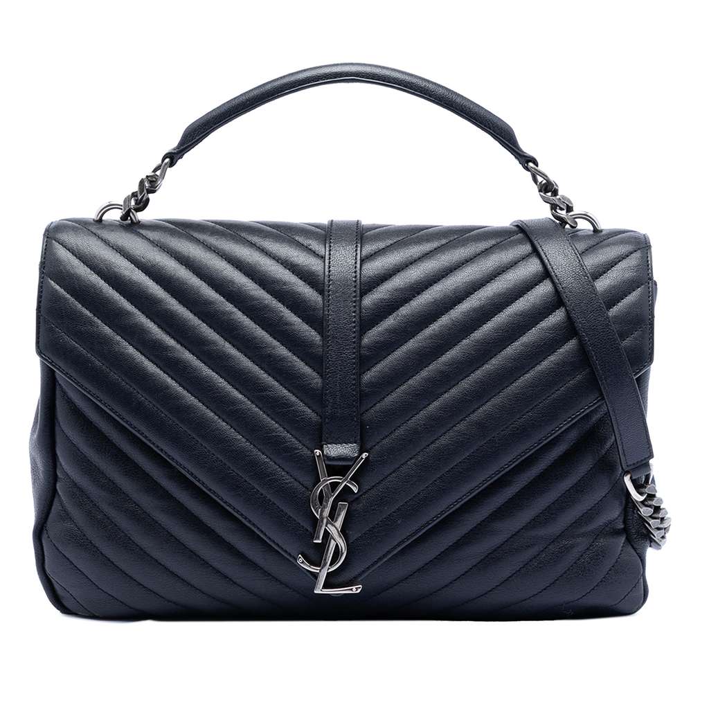 The College satchel features a quilted sheepskin body, a flat leather top handle, a detachable curb chain strap, a front flap with magnetic snap button closure, an exterior slip pocket, and an interior zip compartment.