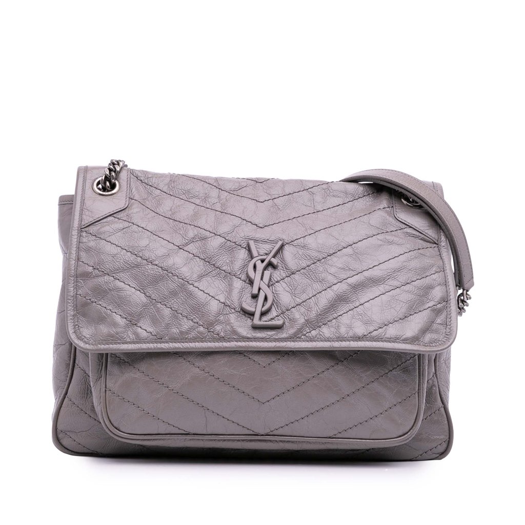 The Niki shoulder bag features a quilted leather body, chain-link straps with leather shoulder guards, a front flap with magnetic snap button closure, an exterior front pocket under the flap, an exterior back slip pocket, and interior zip and slip pockets.