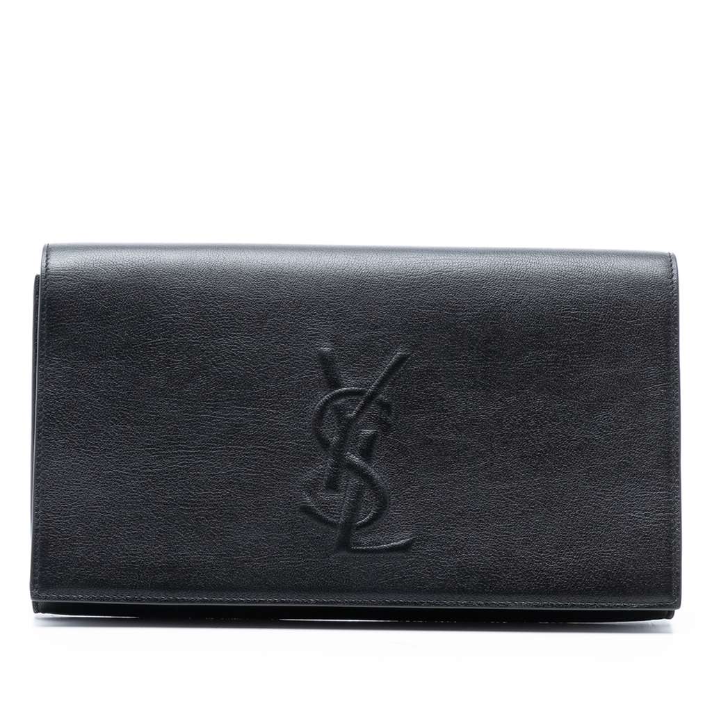 The Belle de Jour clutch bag features a leather body, a front flap with magnetic button closure, and an interior slip pocket.