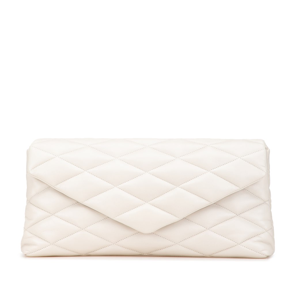 This clutch features a quilted lambskin leather body, a front flap with magnetic closure, and an interior zip pocket.