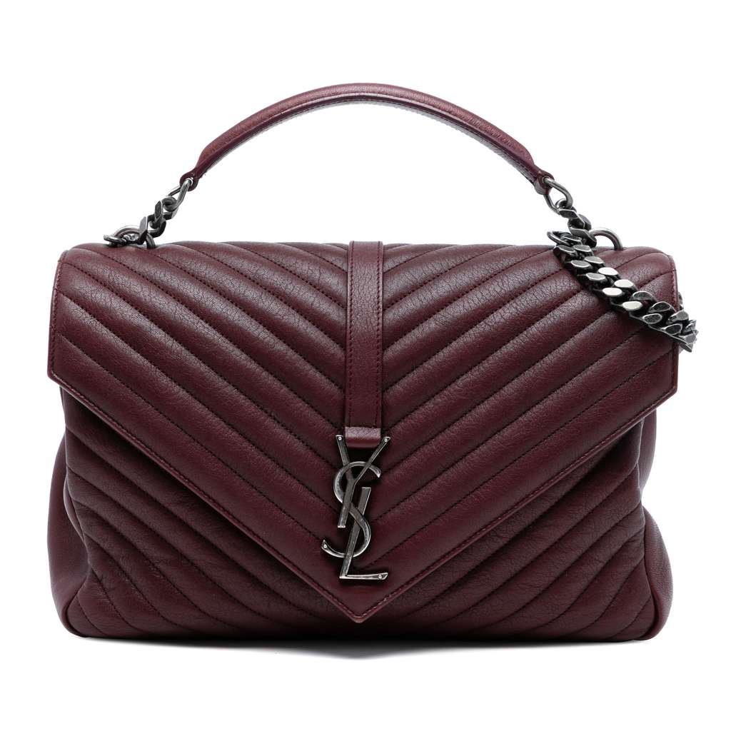 The College satchel features a quilted sheepskin body, a flat leather top handle, a detachable curb chain strap, a front flap with magnetic snap button closure, an exterior slip pocket, and an interior zip compartment.