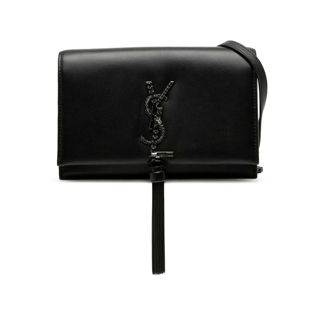 The Kate features a leather body with a tassel, a chain-link strap with leather guard, a front flap with magnetic snap closure, and interior zip and slip compartments.