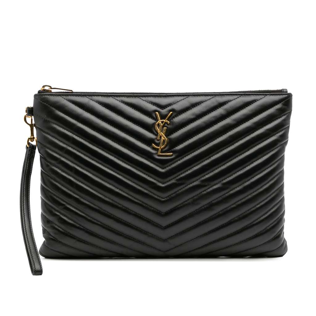 This clutch bag features a quilted leather body, a detachable flat leather wrist strap, a top zip closure, and interior slip pockets.