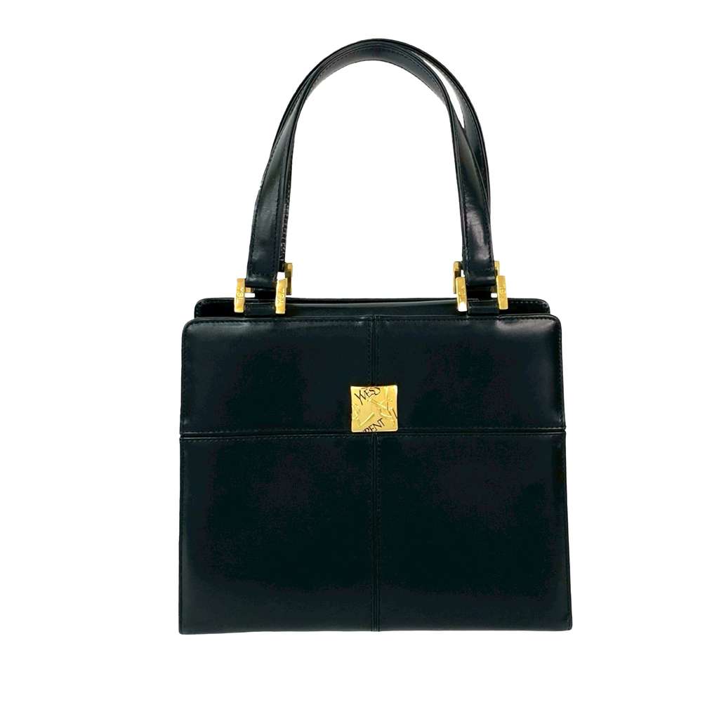 This handbag features a leather body, flat leather handles, an open top with snap closure, and an interior zip pocket.